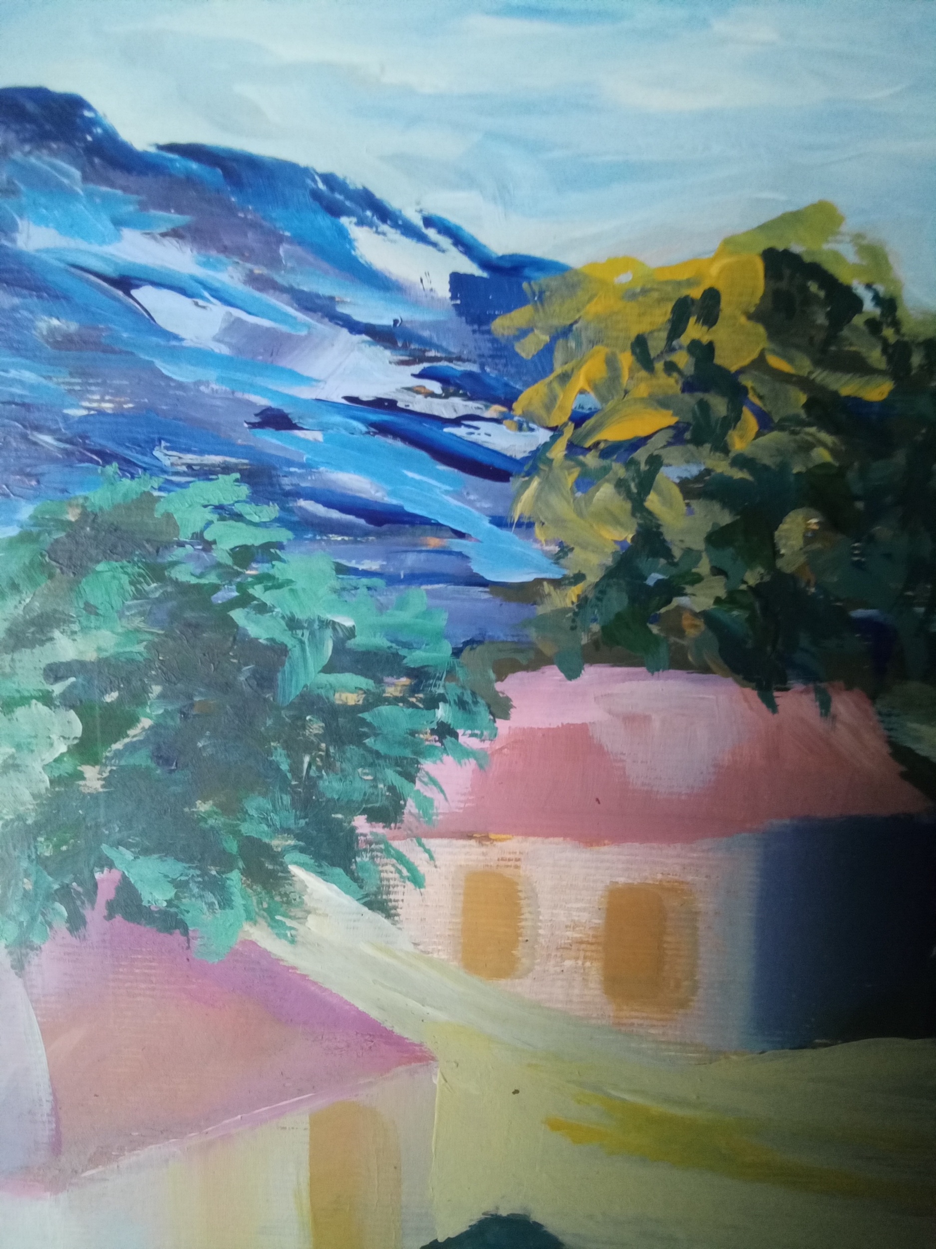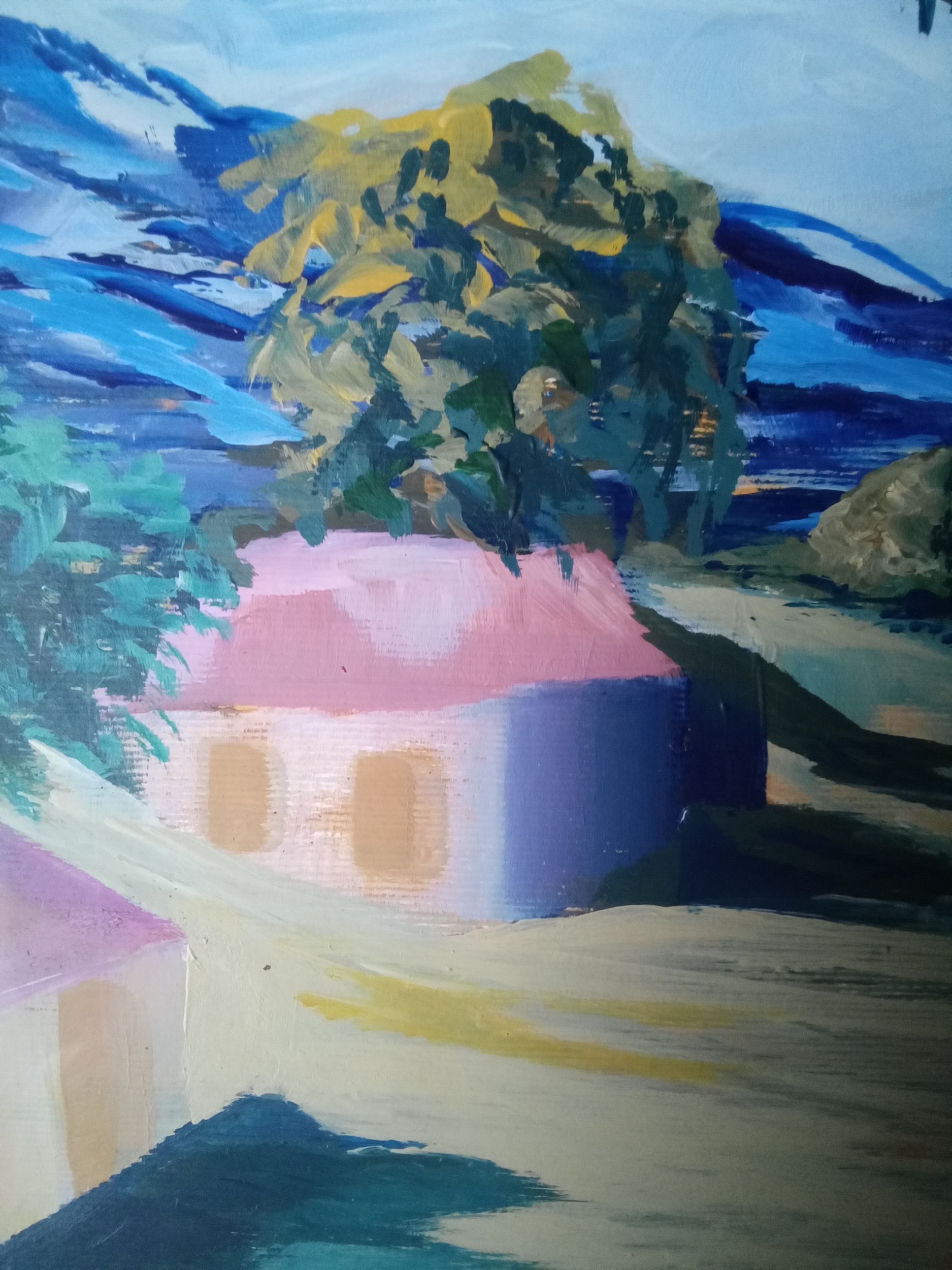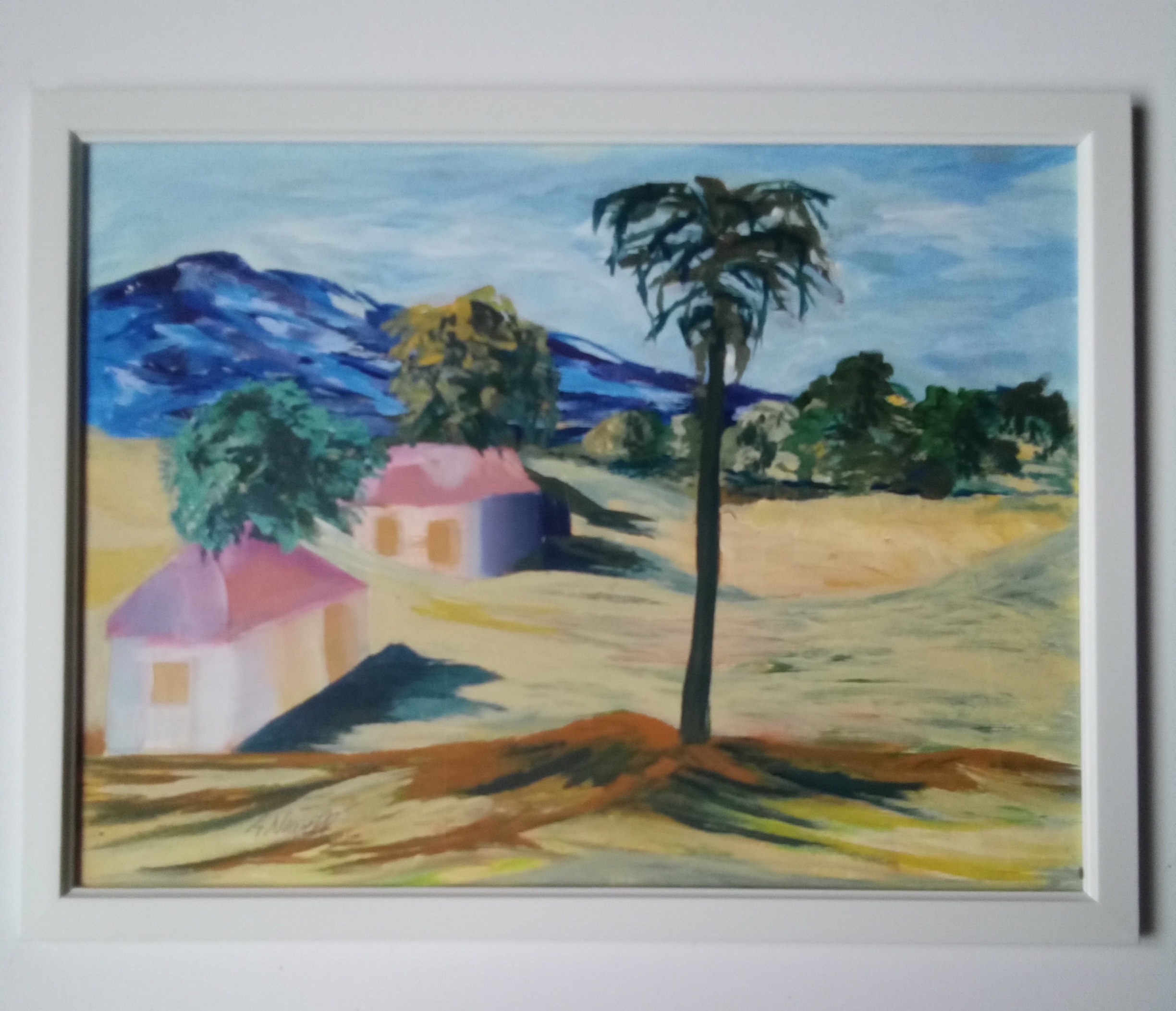 A painting of hot desert with some simple houses, in the fore front is a strong and majestic palm-tree.