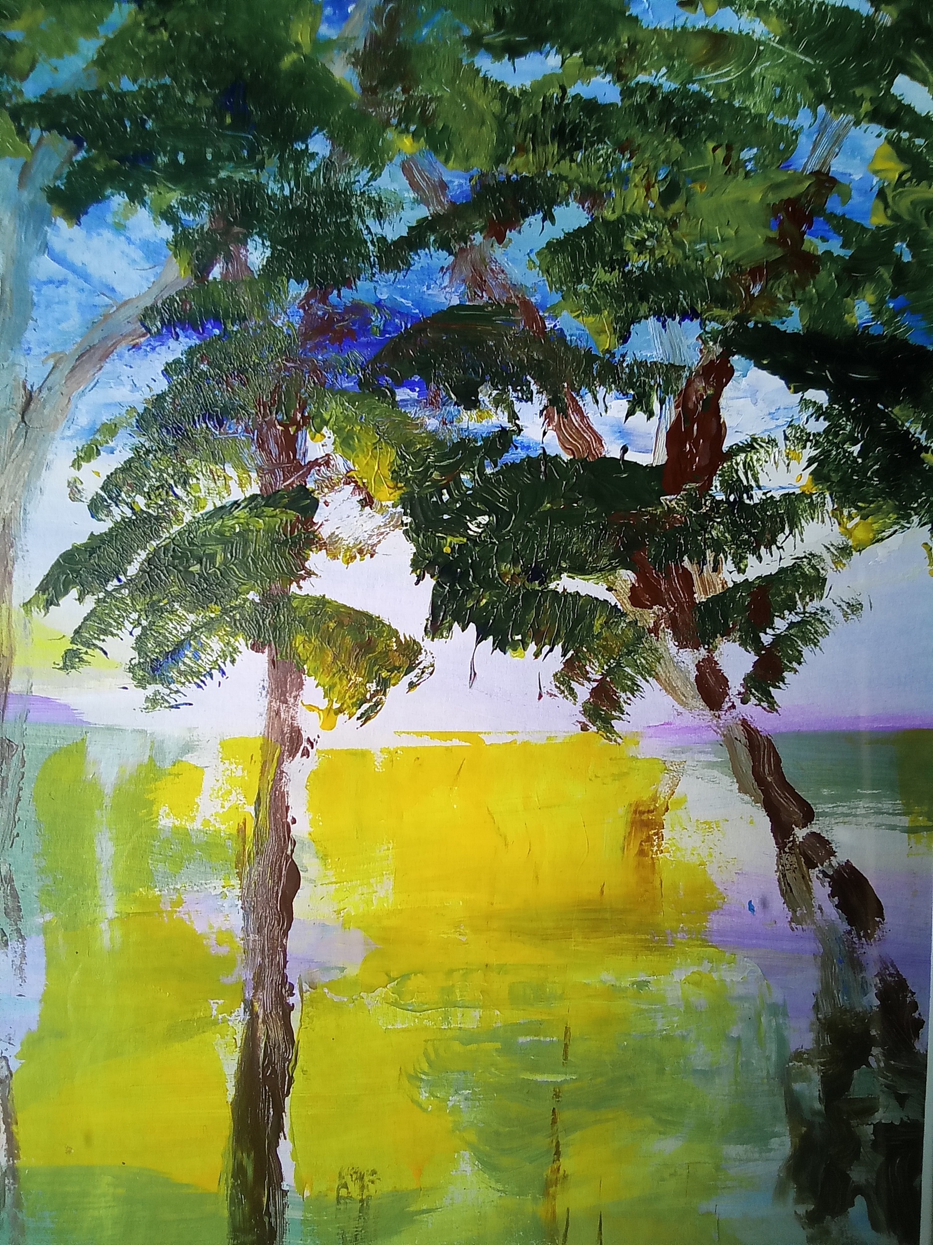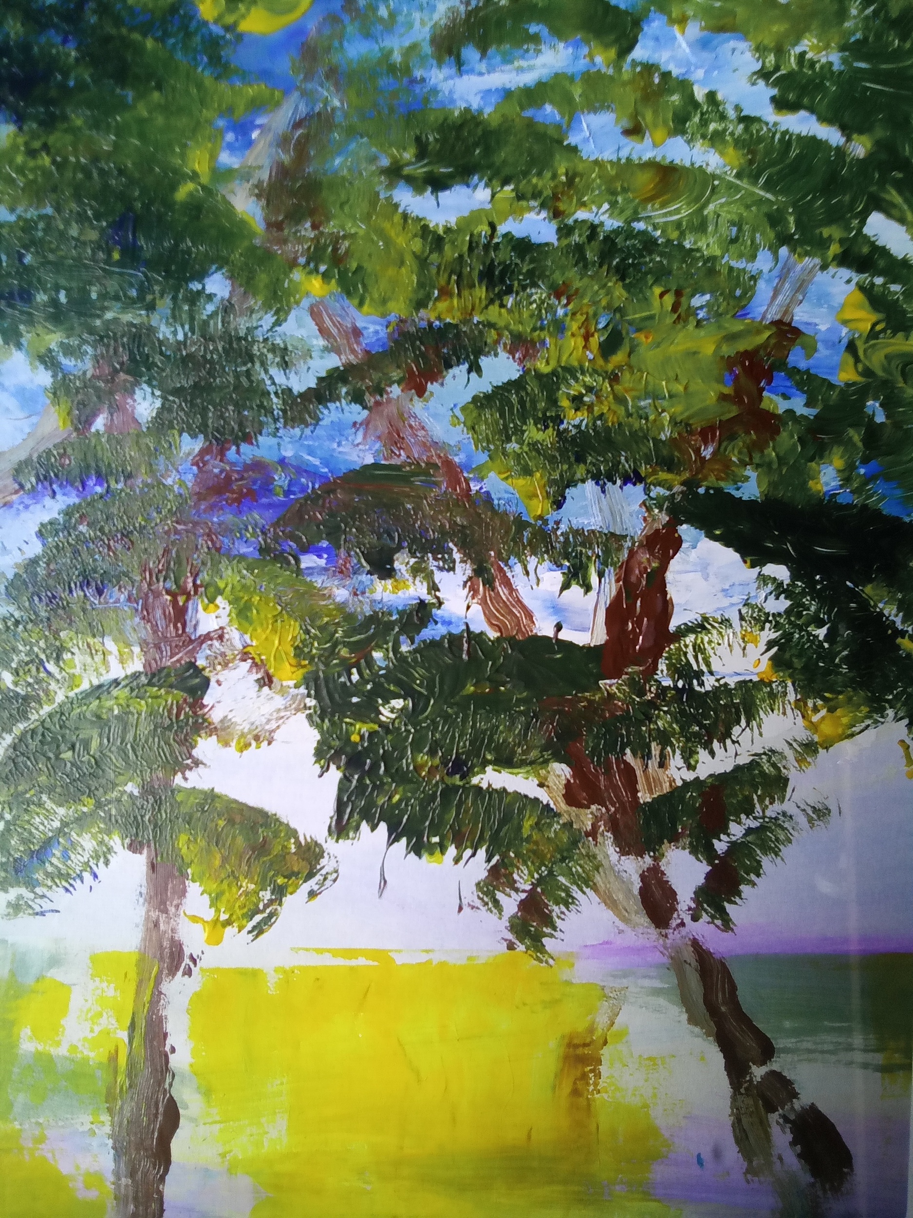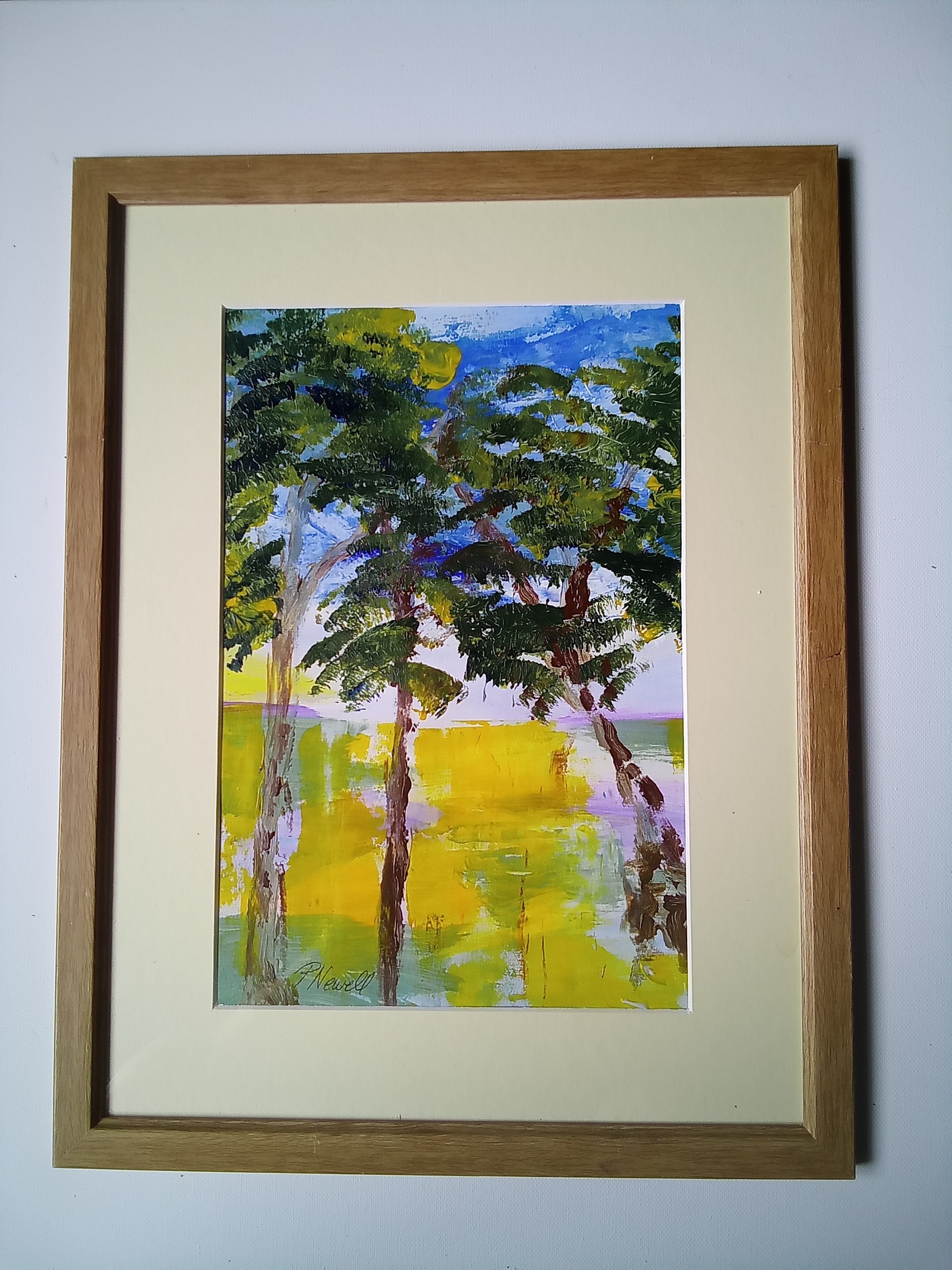 The South Coast of England has a varied landscape This semi abstract painting symbolise trees meeting the sandy dunes.